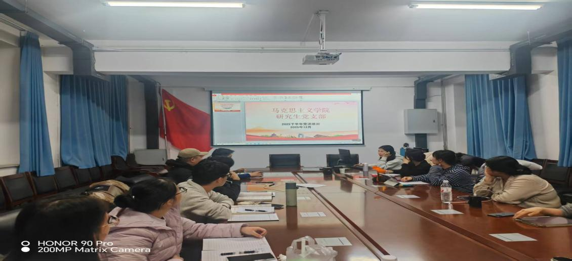为深入学习贯彻党的二十届四中全会精神,强化党规党纪党性教育,铸牢中华民族共同体意识,引导发展对象和积极分子端正入党动机、坚定理想信念,马克思主义学院研究生党支部于2025年12月1日晚19:00马克思主义学院研究生党支部召开了2025下半年积极分子党课培训工作。本次培训覆盖学院研究生党支部的积极分子、发展对象。