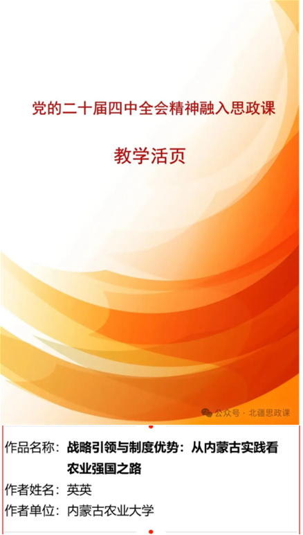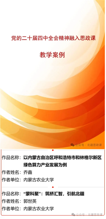 经严格遴选评审,我院教师成果喜获佳绩:英英老师的教学活页《战略引领与制度优势:从内蒙古实践看农业强国之路》成功入选优秀教学活页;乔鑫老师的教学案例《以内蒙古自治区呼和浩特市和林格尔新区绿色算力产业发展为例》、郭世英老师的教学案例《“蒙科聚”:筑桥汇智,引航北疆》成功入选优秀教学案例。