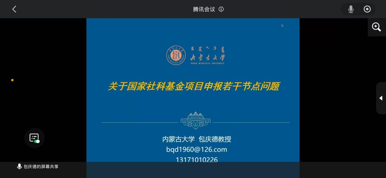 为切实提升我院教师申报国家社科基金项目的能力与水平,精准把握申报要点、破解申报难题。1月24日晚,学院特邀内蒙古大学包庆德教授通过腾讯会议开展2026年国家社科基金项目申报专题指导讲座。会议由院长李士珍主持。